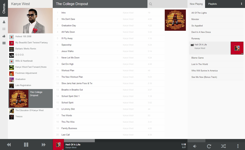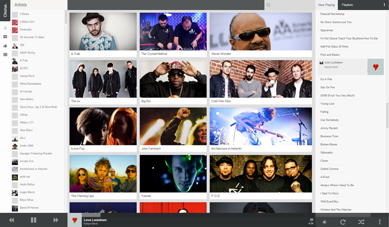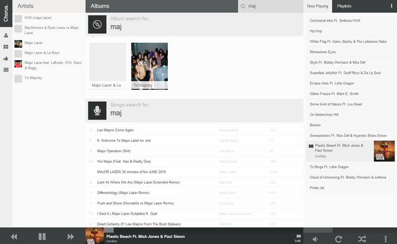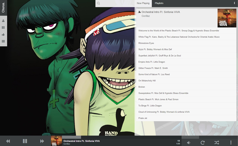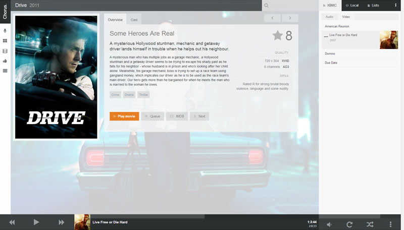 A nice modern Web UI for your XBMC. Browse your Music, Movies or TV Shows from the comfort of your own web browser. You can play media via XBMC or stream it in your browser. Works best with Chrome but plays well with most modern browsers. Used by the Doghouse Media Team to control the shared office music box (an old pc running XBMC with chorus, plugged into an amp and a NAS)